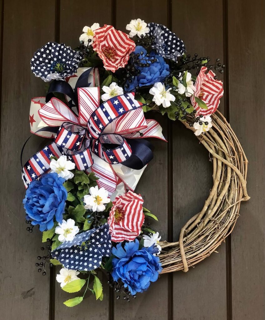 This American Flag Bow wreath caught my eye, and I simply had to stop scrolling! The greenery looks so fresh and full, like someone just picked it from their garden, and those stars and stripes burlap bows tie it all together in the sweetest way.